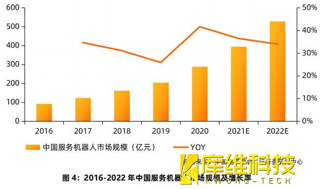 2021年我國服務機器人市場規(guī)模預計達到393.3億元,2016-2021年的年均復合增速達34%,市場規(guī)模總體增速高于工業(yè)機器人。近年來,服務型機器人產(chǎn)品的消費需求不斷升級、消費群體日益擴大,C端市場應用滲透率不斷提升,預計2022年我國服務機器人的市場規(guī)模將達到500-550億元。