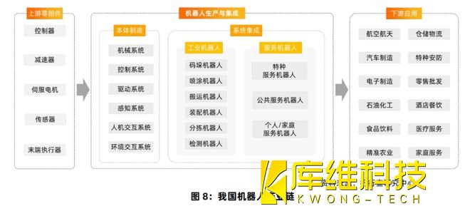 中游本體制造和系統(tǒng)集成:涵蓋機器人本體制造商以及面向應用部署服務的系統(tǒng)集成商。其中,本體制造商在機器人本體結構設計和加工制造的基礎上,通過集成上游零部件實現(xiàn)機器人整機的生產(chǎn);系統(tǒng)集成商則成為連接生產(chǎn)企業(yè)和客戶的橋梁,通過面向具體用戶需求的定制化集成開發(fā),實現(xiàn)機器人在特定場景中的實際布署。