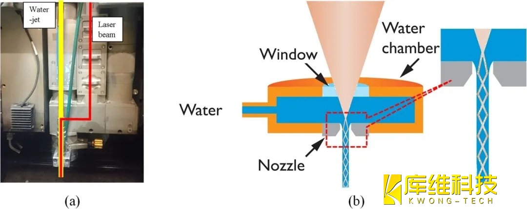 圖1(a)和圖1(b)分別顯示了水導(dǎo)激光系統(tǒng)的照片視圖和原理圖,其中激光束通常為535 nm激光,聚焦在直徑為40 ~ 150 μm的加壓水射流上。加壓的水射流作為光束導(dǎo)流器,通過全內(nèi)反射將激光脈沖引導(dǎo)到激光照射區(qū)。雖然激光聚焦光斑尺寸小于水射流直徑,但由于內(nèi)部反射,激光束在水射流內(nèi)部均勻化,在激光照射區(qū)域內(nèi),光束和射流的直徑保持不變。