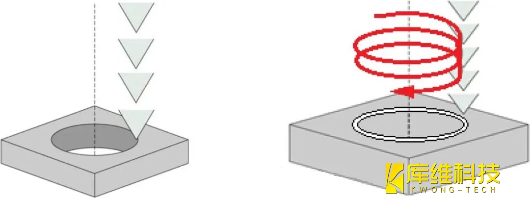 2、水導(dǎo)激光打孔角孔時,孔前緣僅在打孔開始時經(jīng)歷高溫。隨著鉆孔向下移動(以螺旋方式),高溫區(qū)域已完全包含在激光照射區(qū)域內(nèi),從而實現(xiàn)無分層鉆孔。這與毫秒激光鉆孔相反,在毫秒激光鉆孔中,從鉆孔過程開始到結(jié)束,在孔的前緣可以觀察到有明顯更高的溫度。