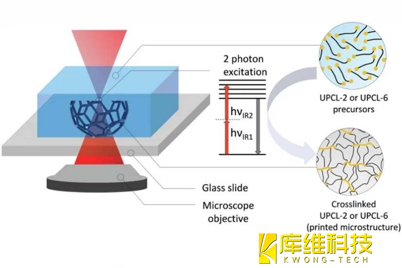 雙光子聚合(2PP)是一種微納3D打印技術,它通過飛秒脈沖激光選擇性固化感光樹脂,類似于光固化快速成型,但2PP 3D打印技術能以幾百納米的分辨率生產復雜的三維(3D)結構,精度遠高于傳統光固化成型技術。奧地利學者Aleksandr Ovsianikov就曾使用雙光子聚合技術設計并合成了一種含有六官能氨基甲酸酯基遙爪聚己內酯(PCL)的材料,這種材料能滿足生物醫學微支架制造的需求,在組織工程領域具有巨大的應用潛力。