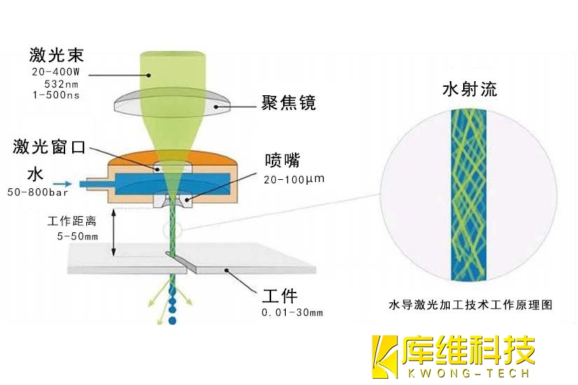 原理:利用激光通過(guò)壓力調(diào)制的水腔,將激光束聚焦在噴嘴上,形成光波導(dǎo),從而引導(dǎo)激光切割。