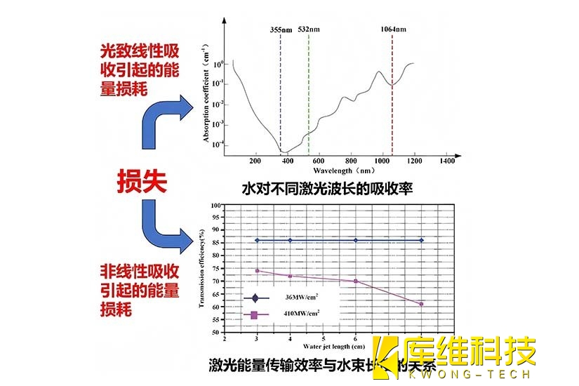 水對激光的吸收系數隨波長顯著變化(圖1 上)。紫外波段(如 355nm)吸收系數極高,能量易被水快速吸收,導致傳輸損耗;紅外波段(如 1064nm)吸收系數較低,能量可在水束中長距離傳輸。例如,1064nm 激光在水中的吸收損耗小,更適合作為水導激光的工作波長,以減少能量衰減,提升傳輸效率。